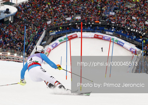 : Fritz Dopfer of Germany skiing in second run of men slalom race of FIS Alpine skiing World Championships in Schladming, Austria. Men slalom race of FIS Alpine skiing World championships Schladming 2013, was held in Schladming, Austria, on Sunday, 17th of February 2013.