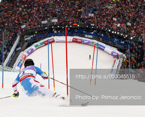 : Third placed Mario Matt of Austria skiing in second run of men slalom race of FIS Alpine skiing World Championships in Schladming, Austria. Men slalom race of FIS Alpine skiing World championships Schladming 2013, was held in Schladming, Austria, on Sunday, 17th of February 2013.