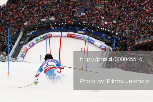 : Third placed Mario Matt of Austria skiing in second run of men slalom race of FIS Alpine skiing World Championships in Schladming, Austria. Men slalom race of FIS Alpine skiing World championships Schladming 2013, was held in Schladming, Austria, on Sunday, 17th of February 2013.