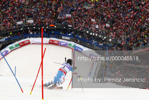 : Third placed Mario Matt of Austria skiing in second run of men slalom race of FIS Alpine skiing World Championships in Schladming, Austria. Men slalom race of FIS Alpine skiing World championships Schladming 2013, was held in Schladming, Austria, on Sunday, 17th of February 2013.