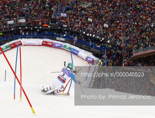 : Second placed Felix Neureuther of Germany skiing in second run of men slalom race of FIS Alpine skiing World Championships in Schladming, Austria. Men slalom race of FIS Alpine skiing World championships Schladming 2013, was held in Schladming, Austria, on Sunday, 17th of February 2013.