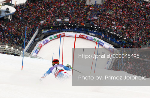 : Winner and new slalom World Champion Marcel Hirscher of Austria skiing in second run of men slalom race of FIS Alpine skiing World Championships in Schladming, Austria. Men slalom race of FIS Alpine skiing World championships Schladming 2013, was held in Schladming, Austria, on Sunday, 17th of February 2013.