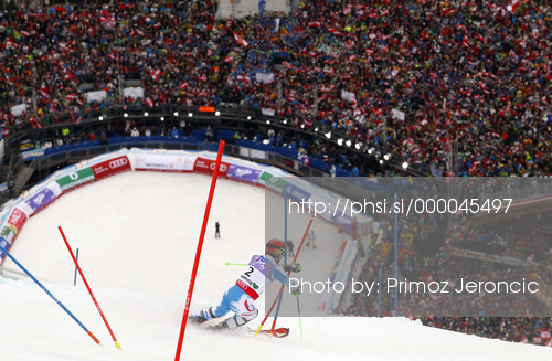 : Winner and new slalom World Champion Marcel Hirscher of Austria skiing in second run of men slalom race of FIS Alpine skiing World Championships in Schladming, Austria. Men slalom race of FIS Alpine skiing World championships Schladming 2013, was held in Schladming, Austria, on Sunday, 17th of February 2013.