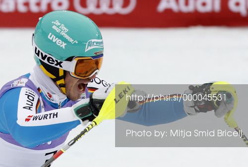 : Second placed Felix Neureuther of Germany reacts in finish of second run of men slalom race of FIS Alpine skiing World Championships in Schladming, Austria. Men slalom race of FIS Alpine skiing World championships Schladming 2013, was held in Schladming, Austria, on Sunday, 17th of February 2013.
