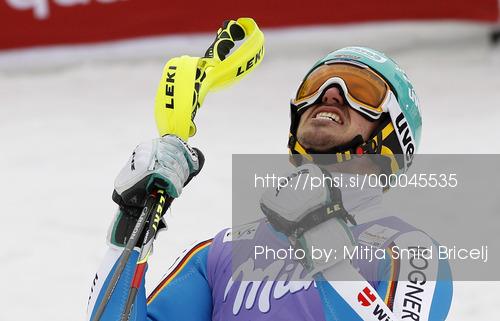 : Second placed Felix Neureuther of Germany reacts in finish of second run of men slalom race of FIS Alpine skiing World Championships in Schladming, Austria. Men slalom race of FIS Alpine skiing World championships Schladming 2013, was held in Schladming, Austria, on Sunday, 17th of February 2013.