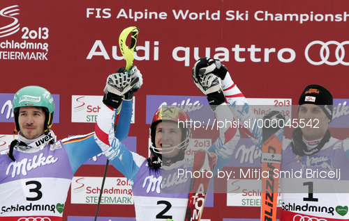 : Winner and new slalom World Champion Marcel Hirscher of Austria (M), second placed Felix Neureuther of Germany (L) and third placed Mario Matt of Austria celebrate their success in finish of second run of men slalom race of FIS Alpine skiing World Championships in Schladming, Austria. Men slalom race of FIS Alpine skiing World championships Schladming 2013, was held in Schladming, Austria, on Sunday, 17th of February 2013.