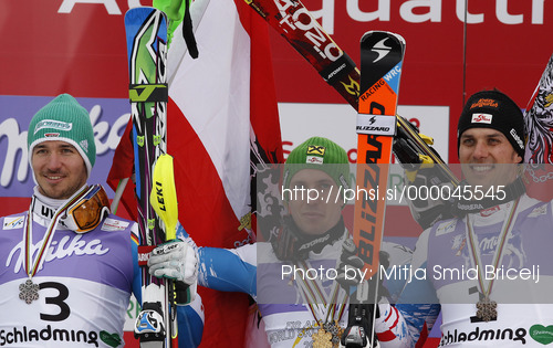 : Winner and new slalom World Champion Marcel Hirscher of Austria (M), second placed Felix Neureuther of Germany (L) and third placed Mario Matt of Austria celebrate their success in finish of second run of men slalom race of FIS Alpine skiing World Championships in Schladming, Austria. Men slalom race of FIS Alpine skiing World championships Schladming 2013, was held in Schladming, Austria, on Sunday, 17th of February 2013.