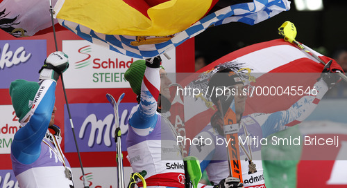 : Winner and new slalom World Champion Marcel Hirscher of Austria (M), second placed Felix Neureuther of Germany (L) and third placed Mario Matt of Austria celebrate their success in finish of second run of men slalom race of FIS Alpine skiing World Championships in Schladming, Austria. Men slalom race of FIS Alpine skiing World championships Schladming 2013, was held in Schladming, Austria, on Sunday, 17th of February 2013.