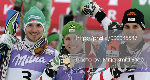 : Winner and new slalom World Champion Marcel Hirscher of Austria (M), second placed Felix Neureuther of Germany (L) and third placed Mario Matt of Austria celebrate their success in finish of second run of men slalom race of FIS Alpine skiing World Championships in Schladming, Austria. Men slalom race of FIS Alpine skiing World championships Schladming 2013, was held in Schladming, Austria, on Sunday, 17th of February 2013.