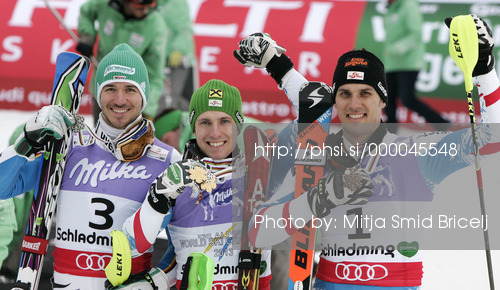 : Winner and new slalom World Champion Marcel Hirscher of Austria (M), second placed Felix Neureuther of Germany (L) and third placed Mario Matt of Austria celebrate their success in finish of second run of men slalom race of FIS Alpine skiing World Championships in Schladming, Austria. Men slalom race of FIS Alpine skiing World championships Schladming 2013, was held in Schladming, Austria, on Sunday, 17th of February 2013.