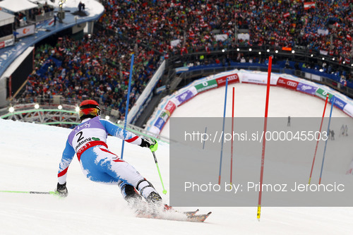 : Winner and new slalom World Champion Marcel Hirscher of Austria skiing in second run of men slalom race of FIS Alpine skiing World Championships in Schladming, Austria. Men slalom race of FIS Alpine skiing World championships Schladming 2013, was held in Schladming, Austria, on Sunday, 17th of February 2013.