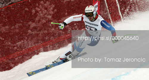 : Sandro Viletta of Switzerland skiing in second training for men downhill race of FIS Alpine skiing World Cup in Garmisch-Partenkirchen, Germany. Second training for men downhill race of FIS Alpine skiing World Cup in Garmisch-Partenkirchen, Germany, was held on Friday, 22nd of February 2013.