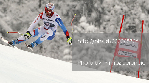 : Didier Defago of Switzerland skiing in men downhill race of FIS Alpine skiing World Cup in Garmisch-Partenkirchen, Germany. Men downhill race of FIS Alpine skiing World Cup in Garmisch-Partenkirchen, Germany, was held on Saturday, 23rd of February 2013.