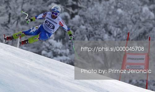 : Rok Perko of Slovenia skiing in men downhill race of FIS Alpine skiing World Cup in Garmisch-Partenkirchen, Germany. Men downhill race of FIS Alpine skiing World Cup in Garmisch-Partenkirchen, Germany, was held on Saturday, 23rd of February 2013.