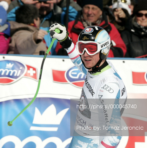 : Hannes Reichelt of Austria reacts in finish of men downhill race of FIS Alpine skiing World Cup in Garmisch-Partenkirchen, Germany. Men downhill race of FIS Alpine skiing World Cup in Garmisch-Partenkirchen, Germany, was held on Saturday, 23rd of February 2013.