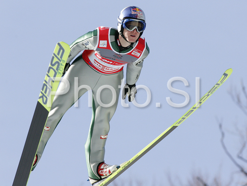 Planica ,Slovenia - 14.03.2008 : Thomas Morgenstern of Austria soars through the air during training jump of FIS Ski jumping World Cup finals in Planica, Slovenia. Training session for FIS Ski jumping World cup was held in Planica, Slovenia, on K215 ski flying hill on 14th of March, 2008.