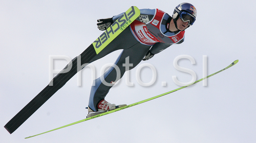 : Thomas Morgenstern of Austria soars through the air during first series of day 1 of FIS Ski jumping World Cup finals in Planica, Slovenia. Day 1 of FIS Ski jumping World cup finals was held in Planica, Slovenia, on K215 ski flying hill on 14th of March, 2008. FIS Ski jumping World cup finals were held in Planica, Slovenia between 13th and 16th of March 2008.