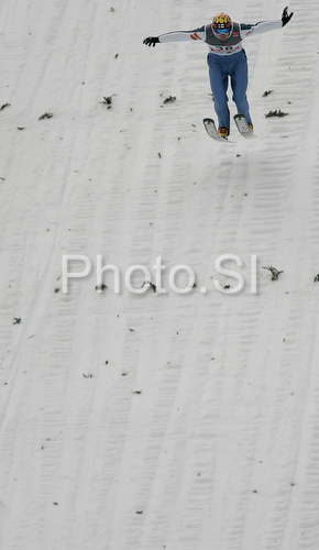 : Janne Ahonen of Finland lands at 221.5m in second jump on day 1 of FIS Ski jumping World Cup finals in Planica, Slovenia. Day 1 of FIS Ski jumping World cup was held in Planica, Slovenia, on K215 ski flying hill on 14th of March, 2008. FIS Ski jumping World cup finals were held in Planica, Slovenia between 13th and 16th of March 2008.