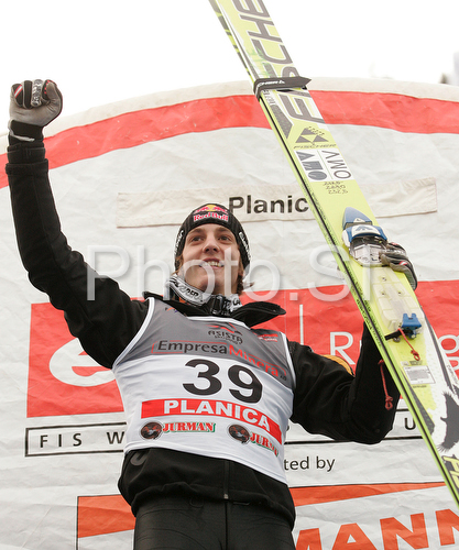 : Winner Gregor Schlierenzauer of Austria celebrate his medal won in first race of FIS Ski jumping World Cup finals in Planica, Slovenia. Training and qualification sessions for FIS Ski jumping World cup were held in Planica, Slovenia, on K215 ski flying hill on 14th of March, 2008. FIS Ski jumping World cup finals were held in Planica, Slovenia between 13th and 16th of March 2008.