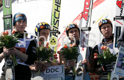 : Second placed team Finland with Janne Happonen, Matti Hautamaeki, Jussi Hautamaeki celebrate their medals won in team event of FIS Ski jumping World Cup finals in Planica, Slovenia. Team event of FIS Ski jumping World cup were held in Planica, Slovenia, on K215 ski flying hill on 15th of March, 2008. FIS Ski jumping World cup finals were held in Planica, Slovenia between 13th and 16th of March 2008.
