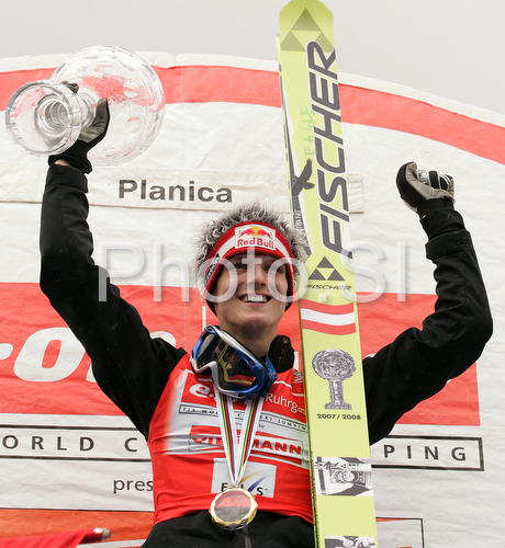 Planica ,Slovenia - 16.03.2008 : Winner of overall Ski jumping World Cup, Thomas Morgenstern of Austria celebrates with his World Cup trophy after FIS Ski jumping World Cup finals in Planica, Slovenia. Training session for race of FIS Ski jumping World cup was held in Planica, Slovenia, on K215 ski flying hill on 16th of March, 2008.