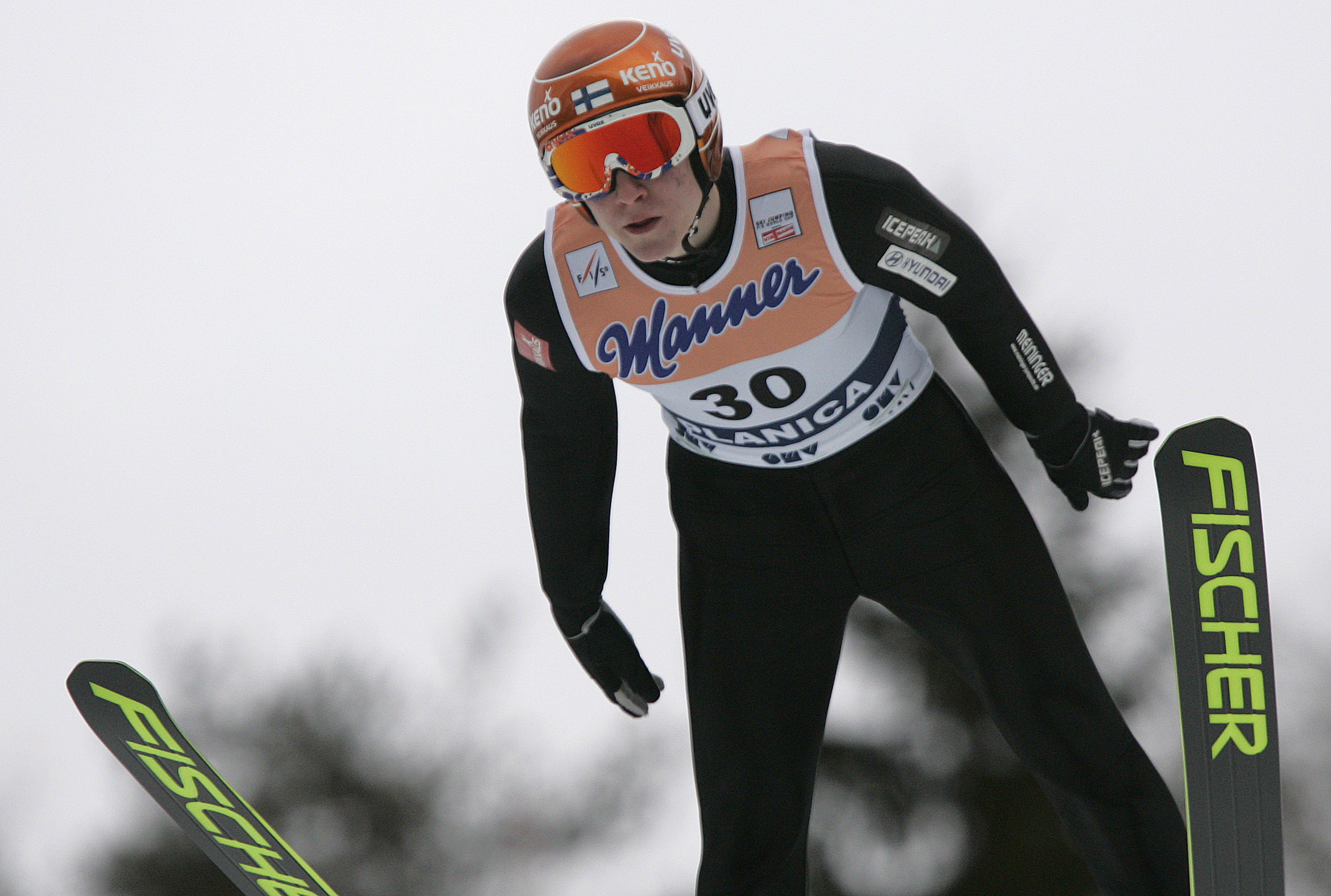 : Ville Larinto of Finland soars through the air during first round of day 1 of FIS Ski jumping World Cup finals in Planica, Slovenia. First day of FIS Ski jumping World cup finals was held on Friday, 20th of March 2009 in Planica, Slovenia.