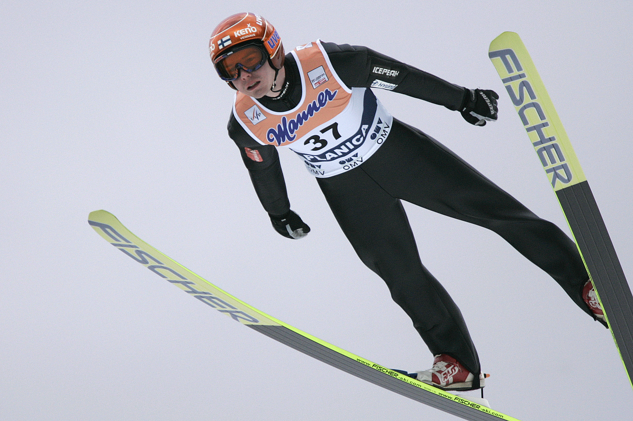 : Eight placed Harri Olli of Finland soars through the air during first round of day 1 of FIS Ski jumping World Cup finals in Planica, Slovenia. First day of FIS Ski jumping World cup finals was held on Friday, 20th of March 2009 in Planica, Slovenia.