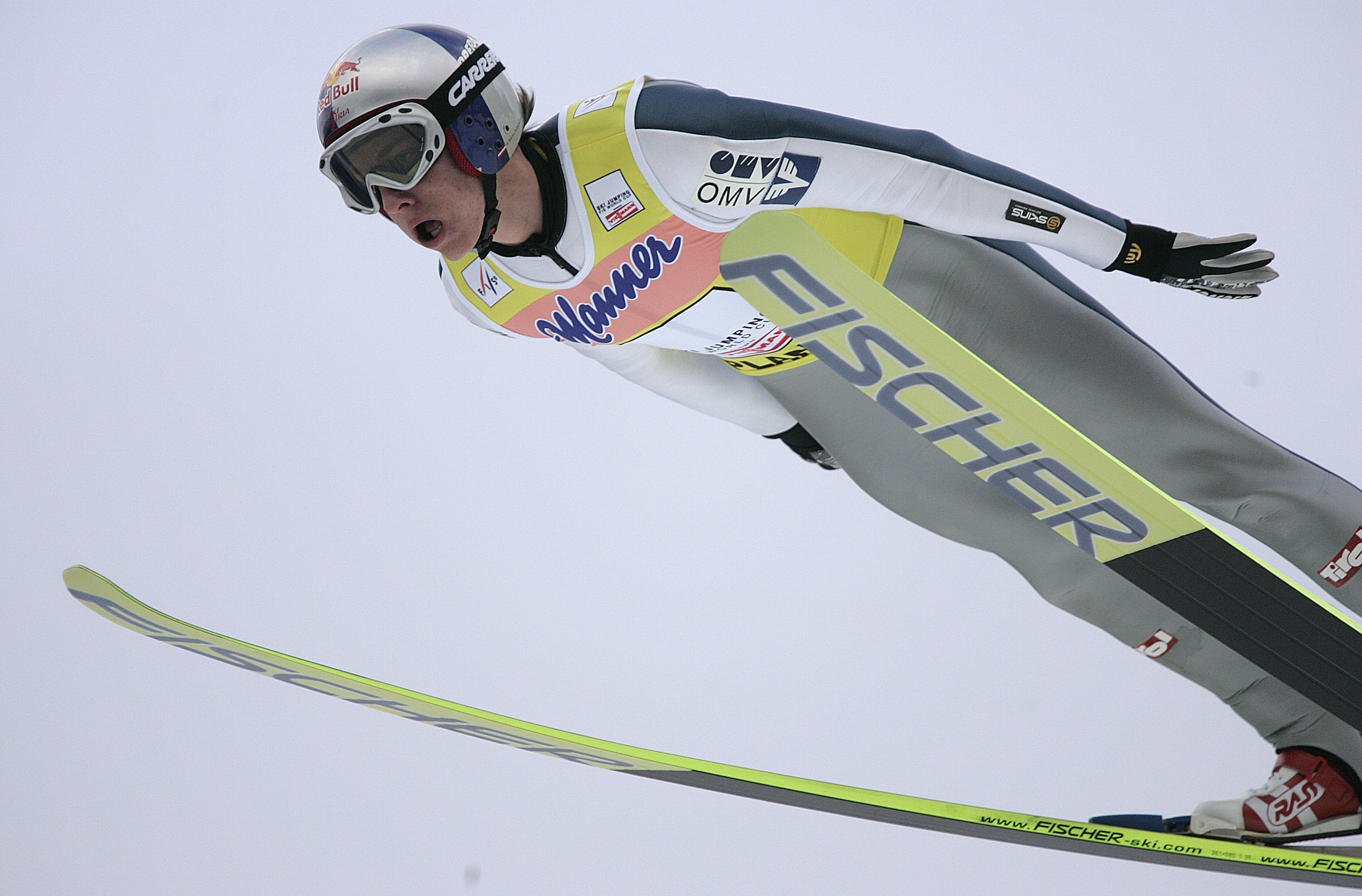 : Winner Gregor Schlierenzauer of Austria soars through the air during first round of day 1 of FIS Ski jumping World Cup finals in Planica, Slovenia. First day of FIS Ski jumping World cup finals was held on Friday, 20th of March 2009 in Planica, Slovenia.