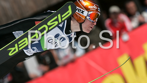 : Ville Larinto of Finland soars through the air during first round of final race of FIS Ski jumping World Cup finals in Planica, Slovenia. Last race of FIS Ski jumping World cup 2008-09 was held on Sunday, 22nd of March 2009 in Planica, Slovenia.