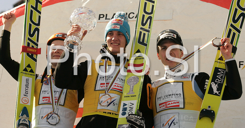 : Winner Gregor Schlierenzauer of Austria (M), second placed Harri Olli of Finland (L) and third placed Simon Ammann of Switzerland (R) celebrate their Ski flying overall World Cup medals after final race of FIS Ski jumping World Cup finals in Planica, Slovenia. Last race of FIS Ski jumping World cup 2008-09 was held on Sunday, 22nd of March 2009 in Planica, Slovenia.