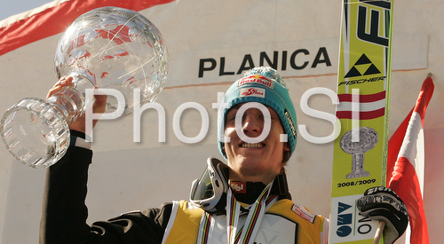 : Gregor Schlierenzauer of Austria celebrate his overall World Cup victory after final race of FIS Ski jumping World Cup finals in Planica, Slovenia. Last race of FIS Ski jumping World cup 2008-09 was held on Sunday, 22nd of March 2009 in Planica, Slovenia.