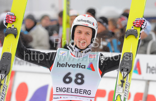 : Simon Ammann (SUI) gewinnt during FIS ski jumping World cup in Engelberg, Switzerland. FIS Ski jumping World Cup race in Engelberg, Switzerland, was held on 18th of December 2009.