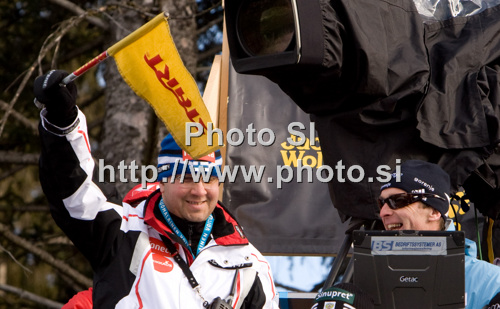Innsbruck ,Austria - 03.01.2010 : Head coach of Finland Janne Vaeaetaeinen lifts the flag for the start during qualification round of the FIS Ski Jumping World Cup event of the 58th Four Hills ski jumping tournament, on January 3, 2010 in Bergisel, Innsbruck, Austria. Photo by: Stringer