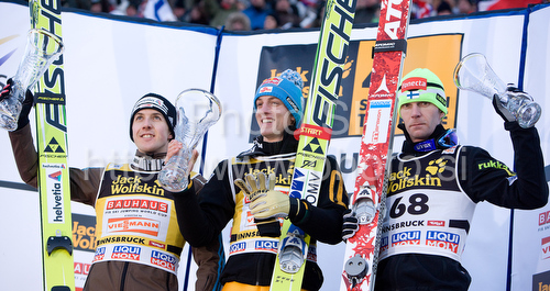 : Second placed Simon Ammann of Switzerland, Winner Gregor Schlierenzauer of Austria and third placed Janne Ahonen of Finland at the medal ceremony after they competed in the Final Round of the FIS Ski Jumping World Cup event of the 58th Four Hills ski jumping tournament, on January 3, 2010 in Bergisel, Innsbruck, Austria.