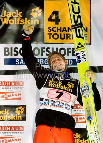 : Winner Thomas Morgenstern of Austria celebrates at the medal ceremony at the last of the FIS Ski Jumping World Cup event of the 58th Four Hills ski jumping tournament, on January 6, 2010 in Bischofshofen, Austria.