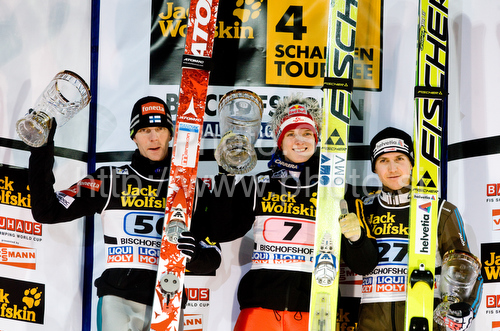: Second placed Janne Ahonen of Finland, Winner Thomas Morgenstern of Austria and third placed Simon Ammann of Switzerland at the medal ceremony at the last of the FIS Ski Jumping World Cup event of the 58th Four Hills ski jumping tournament, on January 6, 2010 in Bischofshofen, Austria.