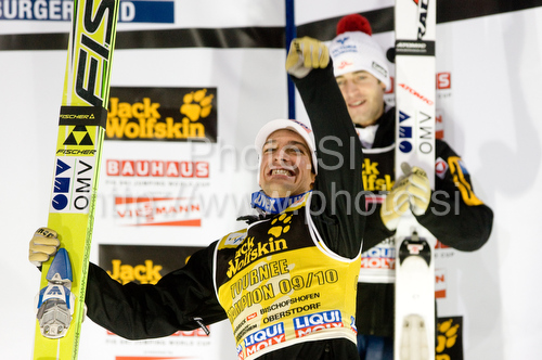 : Andreas Kofler of Austria celebrates winning the 58th Four Hills ski jumping tournament at the medal ceremony, on January 6, 2010 in Bischofshofen, Austria.