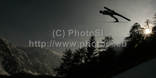 : Ski jumper soars through the air during first day of FIS Ski flying World championships in Planica, Slovenia. First day of FIS Ski flying World Championships was held on Friday, 19th of March 2010, in Planica, Slovenia.