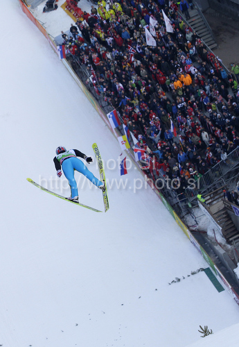 : Leader after first day, Simon Ammann of Switzerland soars through the air during first day of FIS Ski flying World championships in Planica, Slovenia. First day of FIS Ski flying World Championships was held on Friday, 19th of March 2010, in Planica, Slovenia.