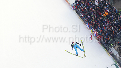 : Leader after first day, Simon Ammann of Switzerland soars through the air during first day of FIS Ski flying World championships in Planica, Slovenia. First day of FIS Ski flying World Championships was held on Friday, 19th of March 2010, in Planica, Slovenia.