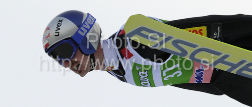 : Adam Malysz of Poland soars through the air during first day of FIS Ski flying World championships in Planica, Slovenia. First day of FIS Ski flying World Championships was held on Friday, 19th of March 2010, in Planica, Slovenia.
