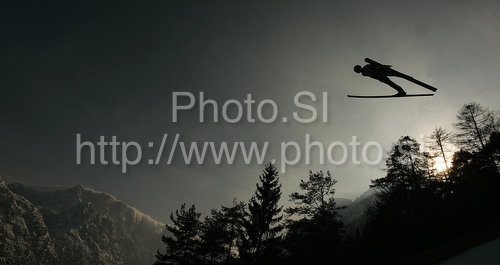 : Ski jumper soars through the air during first day of FIS Ski flying World championships in Planica, Slovenia. First day of FIS Ski flying World Championships was held on Friday, 19th of March 2010, in Planica, Slovenia.