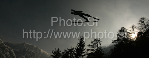 : Ski jumper soars through the air during first day of FIS Ski flying World championships in Planica, Slovenia. First day of FIS Ski flying World Championships was held on Friday, 19th of March 2010, in Planica, Slovenia.