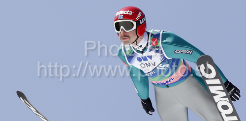 : Matti Hautamaeki of Finland soars through the air during his ski jump of second day of FIS Ski flying World championships in Planica, Slovenia. Second day of FIS Ski flying World Championships was held on Saturday, 20th of March 2010, in Planica, Slovenia.