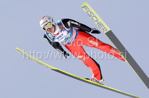: Simon Ammann of Switzerland soars through the air during his ski jump of second day of FIS Ski flying World championships in Planica, Slovenia. Second day of FIS Ski flying World Championships was held on Saturday, 20th of March 2010, in Planica, Slovenia.