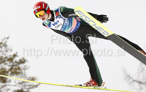 : Olli Muotka of Finland soars through the air during his ski jump of team event of FIS Ski flying World championships in Planica, Slovenia. Second day of FIS Ski flying World Championships was held on Sunday, 21st of March 2010, in Planica, Slovenia.