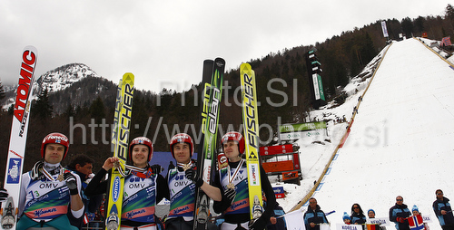 Planica ,Slovenia - 21.03.2010 : Third placed team of Finland with Matti Hautamaeki, Harri Olli, Janne Happonen and Olli Muotka (from L to R) celebrate their medals won in team event of FIS Ski flying World championships in Planica, Slovenia. Second day of FIS Ski flying World Championships was held on Sunday, 21st of March 2010, in Planica, Slovenia. Photo by: Primoz Jeroncic
