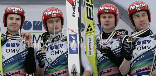 Planica ,Slovenia - 21.03.2010 : Third placed team of Finland with Matti Hautamaeki, Harri Olli, Janne Happonen and Olli Muotka (from L to R) celebrate their medals won in team event of FIS Ski flying World championships in Planica, Slovenia. Second day of FIS Ski flying World Championships was held on Sunday, 21st of March 2010, in Planica, Slovenia. Photo by: Primoz Jeroncic