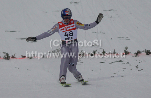 : Adam Malysz of Poland lands in ski jumping race on HS106 hill on FIS Nordic skiing World championships in Oslo, Norway. Ski jumping race on HS106 hill of FIS Nordic skiing World championships was held on Holmenkollen above Oslo, Norway, on Saturday, 26th of February 2011.