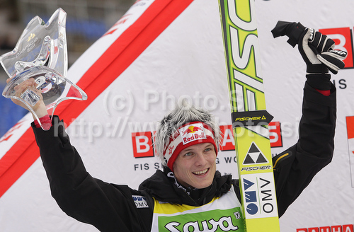 : Second placed Thomas Morgenstern of Austria celebrate his medal won in day 1 of FIS ski jumping World Cup 2010-2011 finals in Planica, Slovenia. Individual competition on first day of FIS ski jumping World cup finals was held on Friday, 18th of March 2011, in Planica, Slovenia.